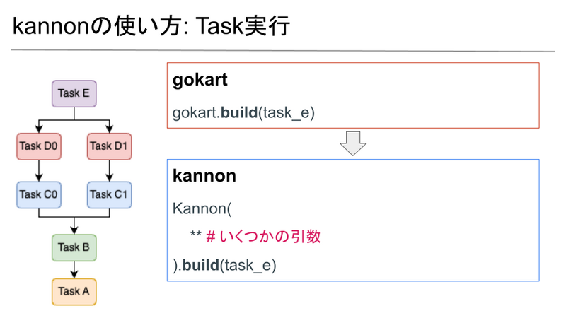 分散したいTaskの継承クラスをgokart.TaskOnKartからkannon.TaskOnBulletに変更します。そしてgokart.build()と同様にKannon(**).build()を実行します。この引数には環境変数関連やk8s関連のものが含まれます。