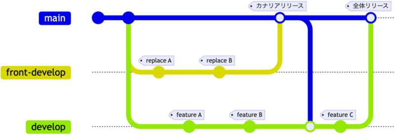 - カナリアリリース: 定期リリースの1週間前に、front-developブランチの内容をmainブランチにマージし、カナリアシャードに対してのみデプロイを実行します。