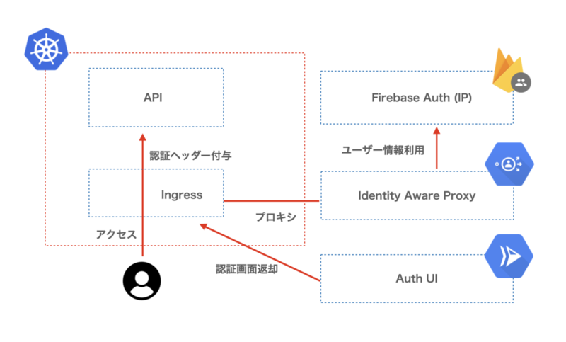 APIへのアクセスがあると、IngressでBackendConfigとして指定したIdentity-Aware Proxyがプロキシし、認証画面を返します。Identity Platformによる認証が成功したら、認証ヘッダーをつけてAPIへリクエストを通します。API内部では署名ヘッダーによるアプリケーションの保護を行なっています。